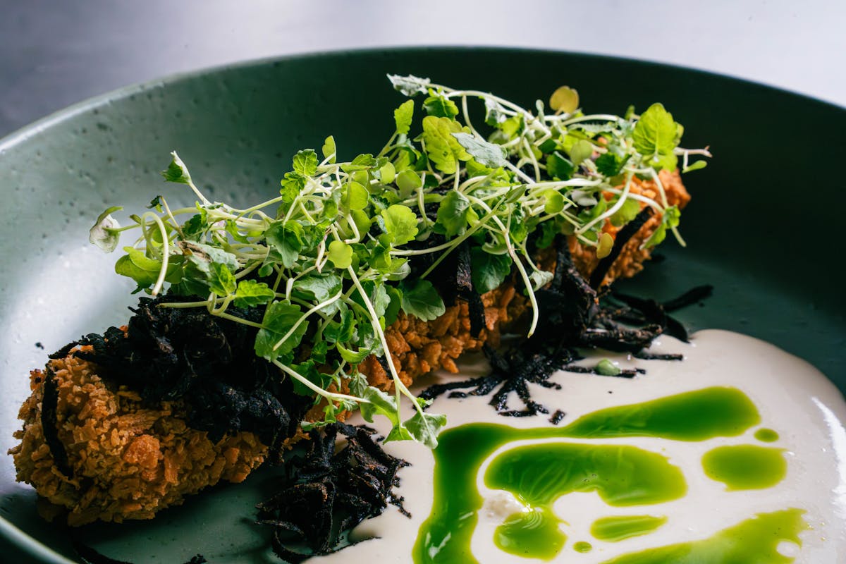 lamb mastelo, smoked mackerel mash, crispy vine leaves